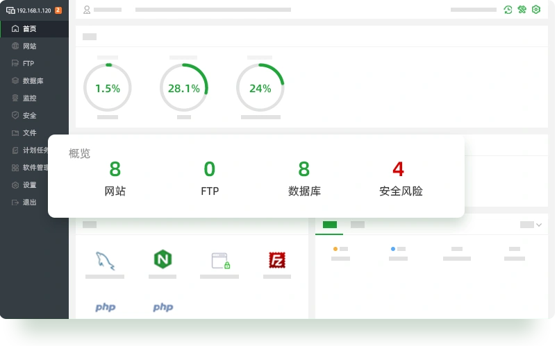 2分鐘裝好面板(ban),一鍵管理服務(wu)器(qi) 集(ji)成LAMP/LNMP環(huan)境(jing)安裝,網站、FTP、數(shu)據(ju)庫、文件管理、軟件安裝等功能